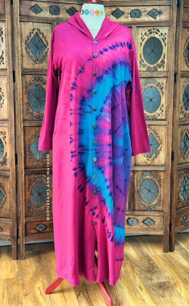 Step into a realm of enchantment with this stunning tie-dye overcoat, a playful fusion of colour and style in a vibrant fuchsia bursting with bold, electric energy—The base is a divine shade of magenta, with swirl patterns that may vary slightly (see images) — each coat is beautifully unique and hand-dyed.