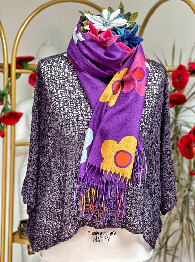Wrap yourself in the beauty of the Daisy Dreams Fringe Scarf — a striking accessory bursting with colour and charm. With its rich purple base and large, vivid daisy motifs, this scarf adds an instant pop to any outfit, whether you’re dressing up or keeping it casual.