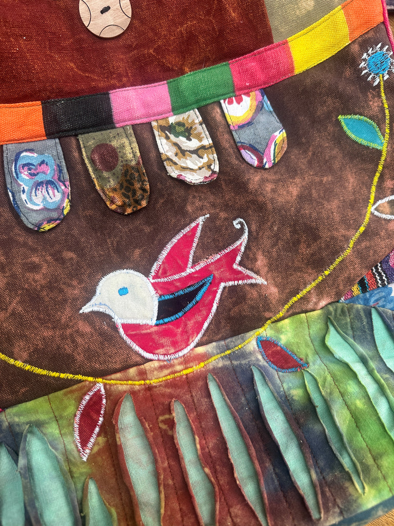 A joyful, oversized tote bag full of charm and storybook character, featuring a sweet appliqué bird nestled among rich, patchwork shades. Big, bold and full of personality, this one-of-a-kind piece feels like something discovered at a countryside market—ready to brighten your everyday wanderings.