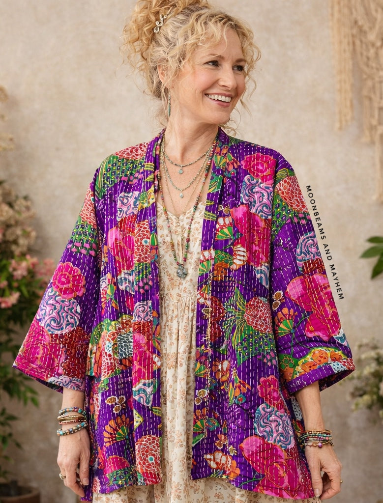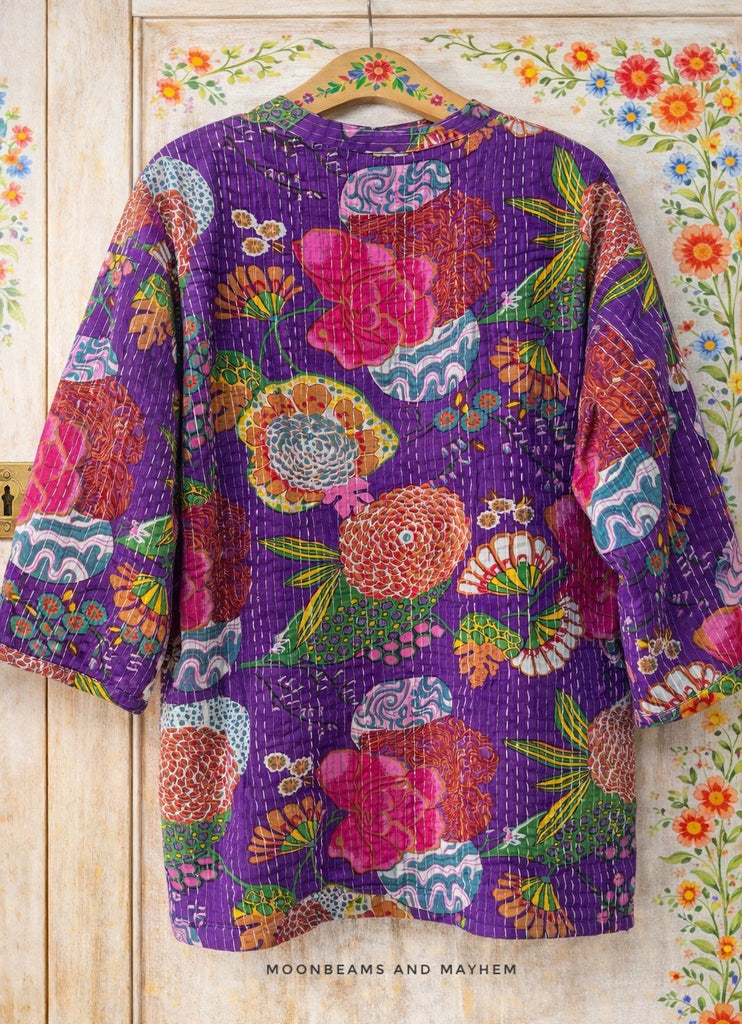 Cotton kantha garments are made up of a double layer of fabric stitched together using traditional stitching , featuring 3/4 sleeves and handy pockets making it as practical as it is beautiful. With an open front and a flowing, relaxed fit, it drapes effortlessly over any outfit—whether layered over jeans and a tee or styled with flowing skirts and barefoot wanderings.