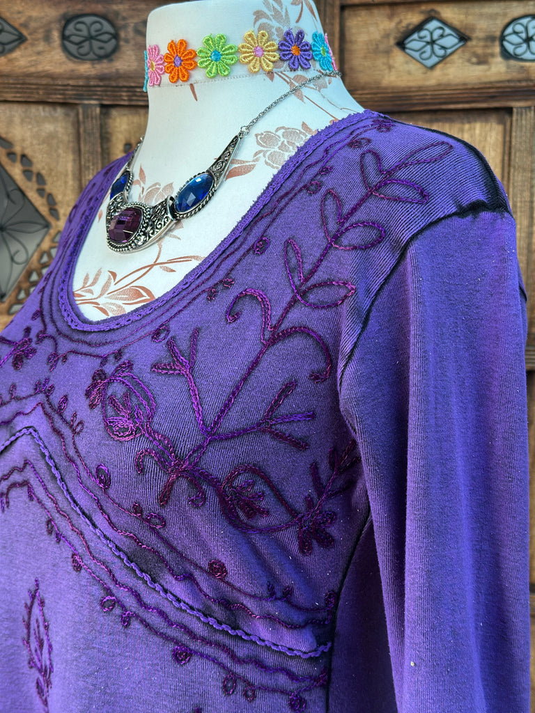 This beautiful purple hippie top is full of magical detail and dreamy boho charm. Made from soft, stretchy cotton, it feels lovely on the skin and moves gently with you. The fabric features embroidered motifs and swirly patterns throughout, adding rich texture and a handcrafted feel.