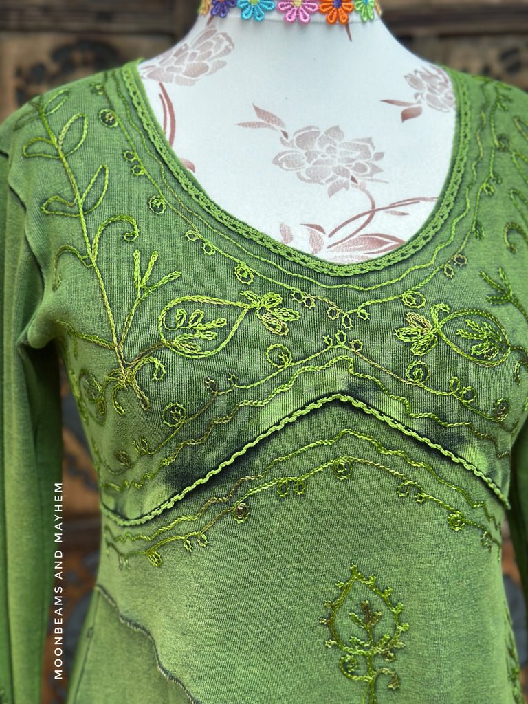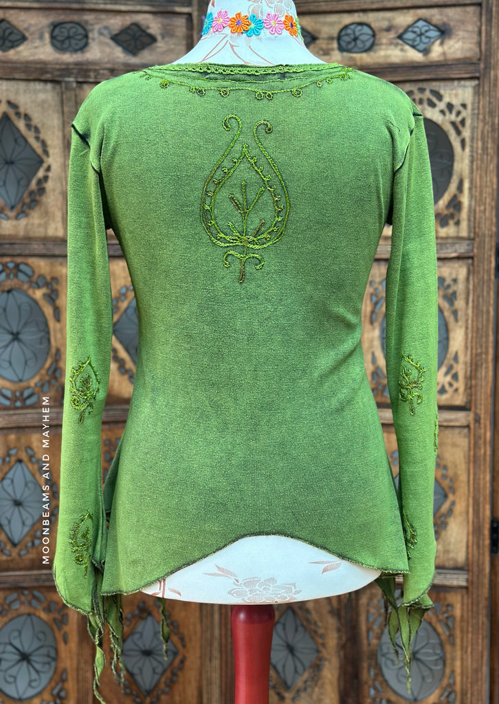 The asymmetric hem creates a gorgeous flowing shape — shorter at the front and longer at the sides — giving it that whimsical, fairy-inspired look. The sleeves flare slightly adding even more character to the design.