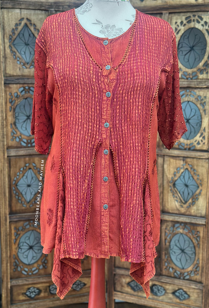 Intricate embroidery and textured detailing adorn the front, finished with antique silver buttons that add a timeless, earthy charm. The sheer sleeves create a light and airy feel, while the handkerchief hemline moves gracefully with every step.