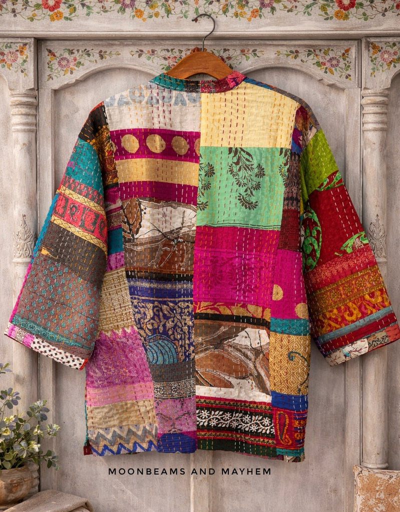 This hip-length beauty is crafted from an eclectic mix of saree patchwork, each panel whispering of celebration, dance, and tradition. No two kimonos are ever the same—the one you choose is yours alone, a wearable work of art that will never be repeated.